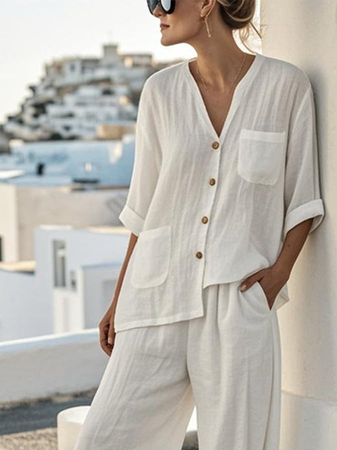 Women'S Solid Color V-Neck Button Cotton And Linen Two-Piece Set