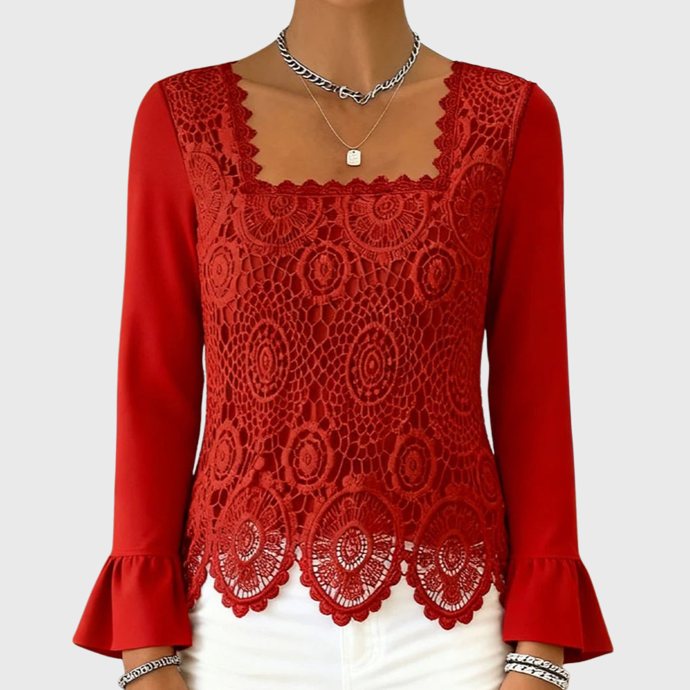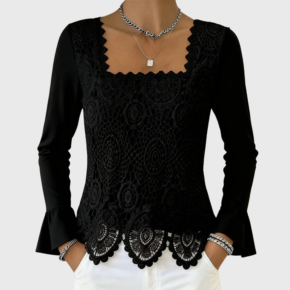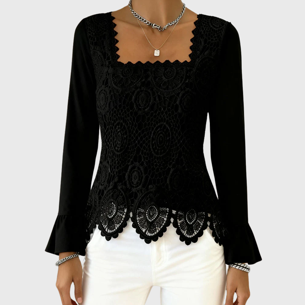Square neckline that frames the face beautifully and pairs perfectly with layered jewelry.